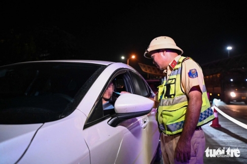 Cảnh sát kiểm tra nồng độ cồn trên cao tốc Pháp Vân - Cầu Giẽ - Ảnh: HỒNG QUANG |