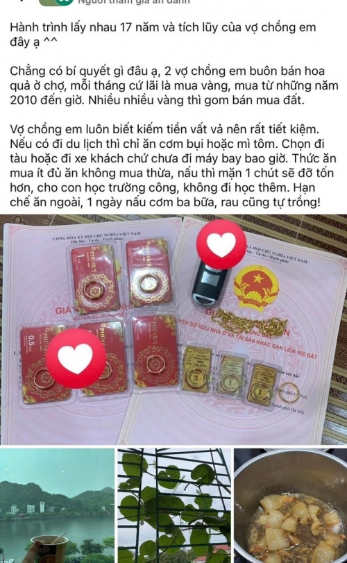 Mạng xã hội những ngày qua chia sẻ câu chuyện một cặp vợ chồng buôn bán hoa quả, sau 17 năm tằn tiện đã mua được vàng, rồi gom mua đất. Cả nhà tiết kiệm đến mức đi du lịch chỉ ăn cơm bụi, mì tôm; chọn tàu xe thay vì máy bay; thức ăn nấu phải mặn hơn để đỡ tốn; con cái học trường công, không đi học thêm; ăn uống tiết kiệm tối đa. Nhờ vậy, họ có tích lũy đáng kể.