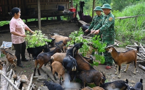 Đoàn viên, thanh niên đồn Biên phòng Tam Hợp giúp dân phát triển kinh tế chăn nuôi dê. |