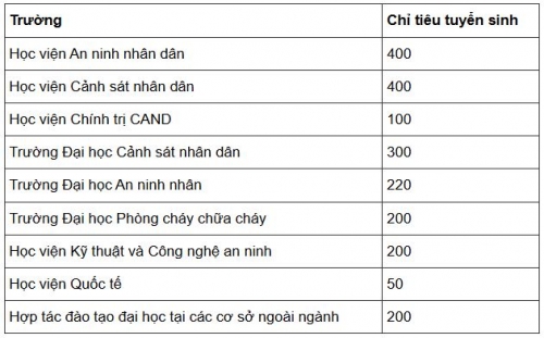 Trong đó, Học viện An ninh nhân dân và Học viện Cảnh sát nhân dân lấy nhiều nhất với 400 chỉ tiêu vào mỗi trường. Học viện Quốc tế lấy ít nhất với 50 chỉ tiêu.