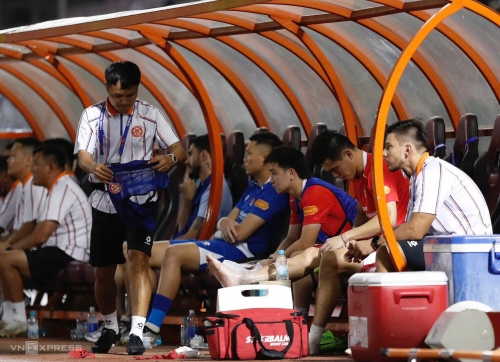 Tiền đạo Công an TP HCM Nguyễn Tiến Linh (thứ hai từ phải sang) buồn bã ở khu kỹ thuật sau khi gặp chấn thương trong trận thua Thanh Hóa 1-2 ở vòng 13 V-League 2025-2026. Ảnh: Hai Tư |