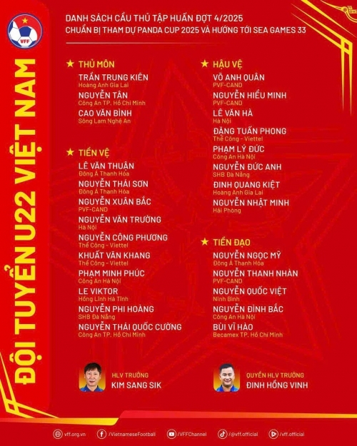 Dẫn dắt U22 Việt Nam thi đấu tại Panda Cup 2025 là quyền HLV trưởng Đinh Hồng Vinh. Sau giải, đội tiếp tục rèn quân tại Bà Rịa - TP.HCM từ 23 đến 29/11, trước khi di chuyển sang Thái Lan bước vào chiến dịch SEA Games 33.