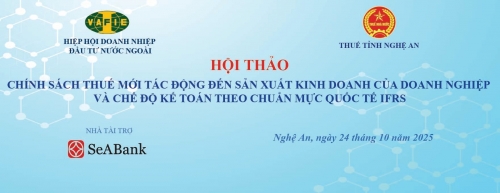 Nhằm tiếp tục đồng hành cùng cộng đồng doanh nghiệp, nâng cao ý thức tuân thủ pháp luật và kịp thời cập nhật những chính sách mới của Nhà nước, ngày 24/10/2025, Hiệp hội doanh nghiệp đầu tư nước ngoài (VAFIE) phối hợp với cơ quan Thuế tỉnh Nghệ An tổ chức Hội thảo Thuế với chủ đề: “Chính sách thuế mới tác động đến sản xuất kinh doanh của doanh nghiệp và chế độ kế toán theo chuẩn mực quốc tế IFRS”.
