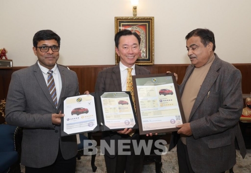 Ông Phạm Sanh Châu (giữa), CEO VinFast châu Á, và ông Tapan Ghosh (trái), CEO VinFast Ấn Độ, nhận chứng chỉ an toàn BNCAP 5 sao cho mẫu xe VF 7 từ ông Nitin Gadkari, Bộ trưởng Giao thông Đường bộ và Cao tốc Ấn Độ. |