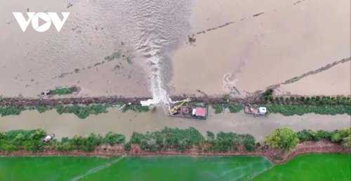 Nhận được tin báo, Ban Chỉ huy Phòng thủ dân sự xã Phương Thịnh đã khẩn trương huy động lực lượng công an, quân sự cùng người dân khu vực trạm bơm với số lượng trên 70 người và điều động 2 chiếc kobe đến hiện trường, phối hợp với lực lượng tại chỗ tiến hành gia cố đoạn đê bị vỡ. Tuy nhiên, do mực nước chênh lệch giữa mặt ruộng và bên ngoài đê cao khoảng 2,5m, áp lực nước lớn, sau hơn 7 giờ khắc phục, việc gia cố đoạn bị vỡ không khắc phục được.