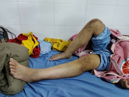 Cháu P.A hiện vẫn đang được điều trị tại bệnh viện, chưa thể tự đi lại do chân tay vẫn còn đau. Ảnh chụp tối 20/11. |