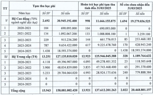 Theo lập luận của nhà trường, khoản tạm thu hơn 158 tỷ đồng cần được phân tích rõ. Trong số tiền này, hơn 127 tỷ đồng thuộc hệ Trung cấp T4 – đối tượng học sinh tốt nghiệp THCS học tiếp lên trung cấp được miễn học phí theo quy định, còn hơn 30,9 tỷ đồng thuộc khối cao đẳng với các ngành nghề độc hại, nặng nhọc được giảm 70% học phí.