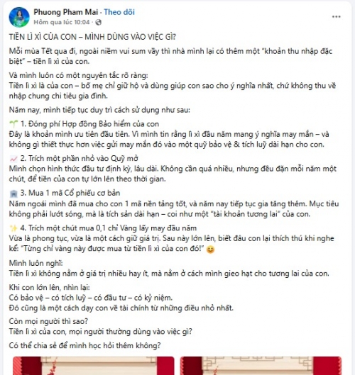 Bên cạnh xu hướng mua vàng số lượng lớn để tích sản, nhiều phụ huynh hiện đại lại lựa chọn chiến lược "chia trứng vào nhiều giỏ" để tối ưu hóa khoản tiền lì xì cho tương lai của con. Từ đó các vị phụ huynh đã dạy cho con bài học thực tế về việc "gieo hạt" cho tương lai qua sự đa dạng hóa danh mục đầu tư. Điển hình là trường hợp của chị Phạm Mai Phương, một người mẹ có quan điểm quản lý tài chính rất rõ ràng và khoa học.