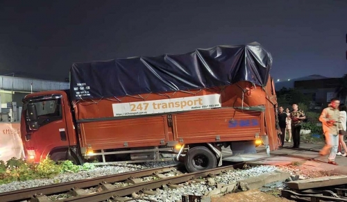Xe tải bị húc văng vào đường ray cứu hỏa |