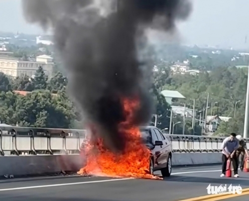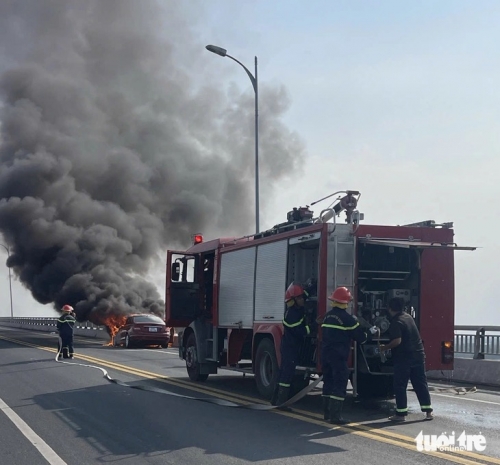 Khi lên gần giữa cầu, ngọn lửa bất ngờ bốc cháy dữ dội phía trước đầu xe.