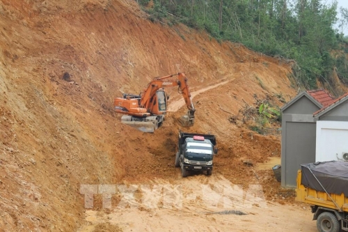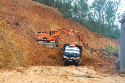 Máy xúc đang “xẻ” chân đồi, múc đất lên xe tải chở đi khỏi hiện trường xảy ra từ nhiều ngày qua tại khu vực gần dốc Kè (xã Vân Tụ, tỉnh Nghệ An). Ảnh: Xuân Tiến - TTXVN |