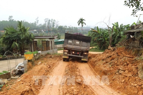 Đường nông thôn xuống cấp, biến dạng vì phải oằn mình “cõng” những xe tải chở đất. Ảnh: Xuân Tiến - TTXVN |