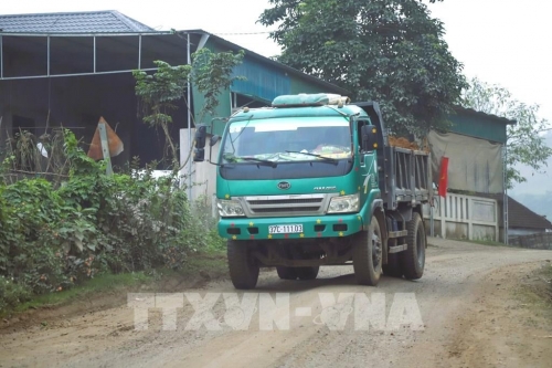 Xe tải chở đất di chuyển trên bề mặt đường đã xuống cấp, võng trũng. Ảnh: Xuân Tiến - TTXVN |
