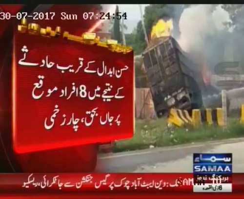Vụ việc xảy ra sáng 30/7 khi chiếc xe tải đang trên đường từ Rawalpindi tới Peshawar. Vụ đâm xe đã gây cháy lớn, khiến 8 người bị bỏng tử vong tại hiện trường.
