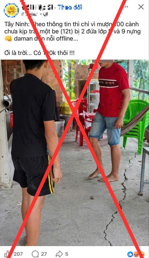 Ngày 23-4, Công an tỉnh Tây Ninh cho biết đã làm việc với chủ tài khoản Facebook đăng tải thông tin sai sự thật về vụ "bé trai bị bạn đánh tử vong do thiếu nợ 100.000 đồng", gây xôn xao dư luận.