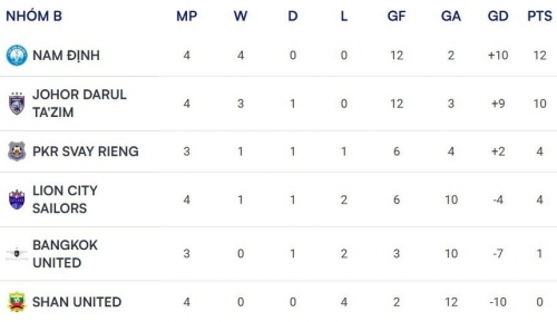 Sau 4 trận, Nam Định dẫn đầu với cách biệt 2 điểm so với Johor Darul Ta'zim. Trong khi đó, các đội bóng xếp dưới đều không còn cơ hội san bằng cách biệt với thầy trò HLV Mauro Jeronimo.