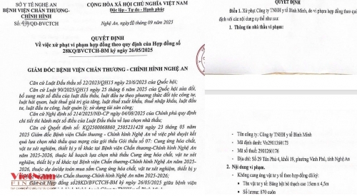 Ngày 10/9/2025, Bệnh viện Chấn thương – Chỉnh hình Nghệ An đã ban hành Quyết định số 434/QĐ-BVCCTH về việc xử phạt vi phạm hợp đồng đối với Công ty TNHH Y tế Bình Minh.