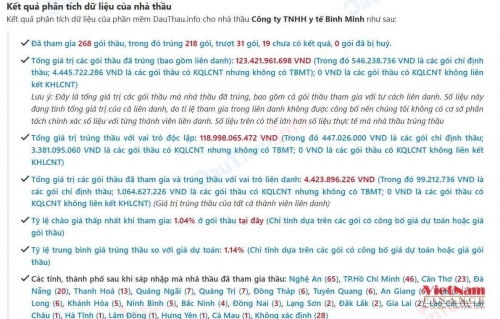 Từ dữ liệu trên hệ thống đấu thầu quốc gia cho thấy, Y tế Bình Minh là một trong những nhà thầu thường xuyên tham gia dự thầu các gói cung cấp thiết bị, vật tư y tế tại nhiều bệnh viện, trung tâm y tế ở Nghệ An và nhiều tỉnh, thành khác.